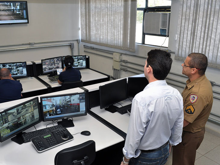 Vinte e quatro câmeras de segurança, que fazem parte do projeto "Olho Vivo", já estão instaladas em Juiz de Fora. Os equipamentos estão localizados na área central da cidade e no bairro Manoel Honório e, até o momento, mais de cem ocorrências já foram registradas com base no acompanhamento das imagens, além de inúmeras abordagens de atividades suspeitas verificadas pelas equipes de monitoramento. Durante a manhã desta terça-feira, 9 de setembro, o prefeito Bruno Siqueira visitou a sala onde ocorrem as operações para verificar o andamento dos trabalhos.