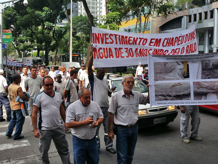 Cerca de 250 funcionários da Companhia de Saneamento Municipal (Cesama) caminharam nas ruas do Centro de Juiz de Fora até à sede da companhia, no cruzamento da avenida Rio Branco com a Getúlio Vargas, na manhã desta sexta-feira, 17 de março, com faixas, cartazes, apitos, alto-falantes e carro de som, pedindo mais transparência do governo municipal na realização das obras da represa de Chapéu D'Uvas.