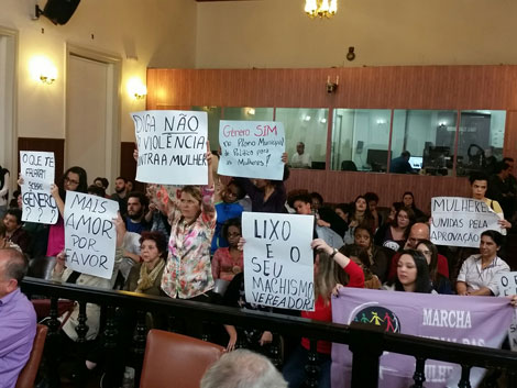 Já Cristina Castro, presidente do Conselho Municipal dos Direitos da Mulher destaca que o plano municipal foi construído com base nas reivindicações das conferências municipais realizadas desde 2005, e quando assumiram o conselho em setembro de 2013, retomaram os debates de ideologia de gênero. "O ano passado foi todo com debates entorno do plano para efetivar e construir o plano com base nestas reivindicações e com plano nacional. Em março deste ano fizemos uma conferência e entregamos o plano aqui na Câmara durante uma audiência pública. Eles querem retirar do plano a palavra gênero e esta palavra é justamente o conceito que fala dos papeis do homem e da mulher na sociedade que são geradores de todo o preconceito e de toda a violência que a mulher sofre" frisa.