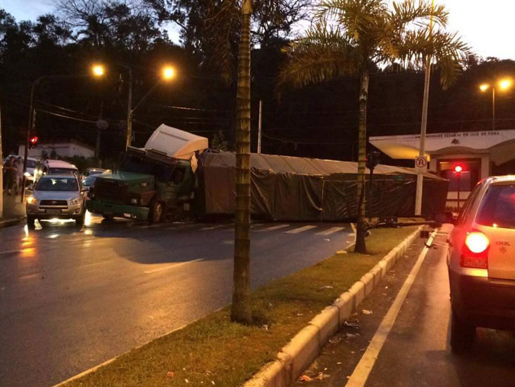 Uma carreta tombou em frente ao Pórtico Sul da UFJF, por volta de 17h40 do último domingo, 26 de julho, interditando a pista da avenida Itamar Franco, no sentido Cidade Alta - Cascatinha há mais de 16 horas. Segundo a Secretaria de Transporte e Trânsito (Settra), quatro agentes de trânsito estão controlando o tráfego no local, que está fluindo nos dois sentidos pela pista de subida. A previsão é de que a carreta seja retirada da pista até às 11h30 desta segunda, 27. Ainda de acordo com a pasta, o veículo transportava uma carga de 32 toneladas de MDF.