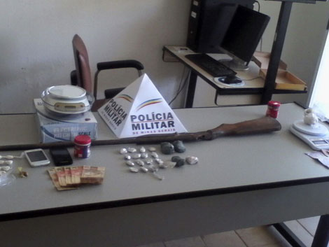 Ao todo, foram localizadas 18 buchas de maconha, quatro tabletes pequenos de maconha, nove papelotes de cocaína, aproximadamente R$ 900,00 em dinheiro, 25 gramas de cocaína, uma espingarda calibre 32. Quatro pessoas foram presas em flagrante.