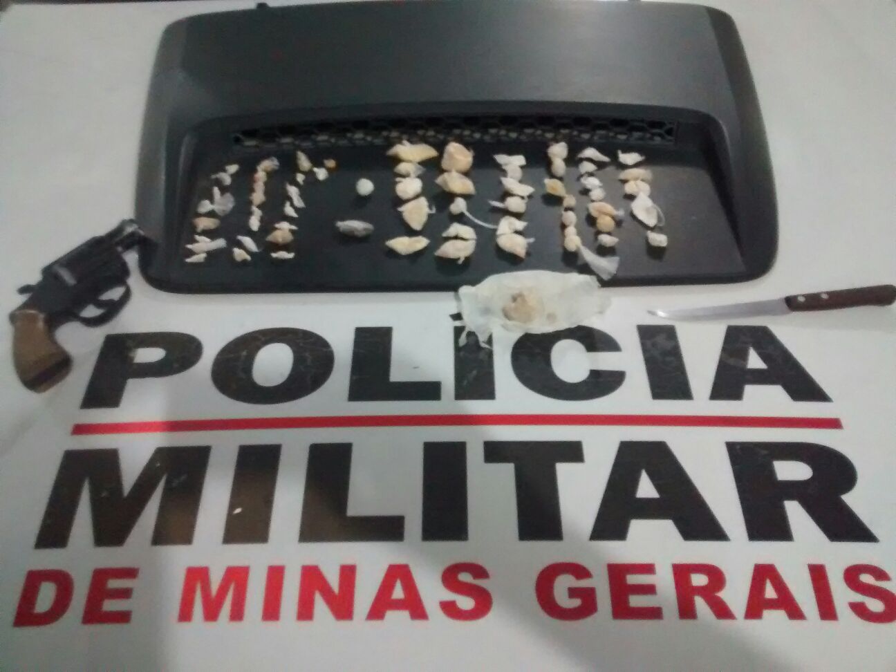 A Polícia Militar (PM) apreendeu neste sábado, 15 de agosto, 35 papelotes de cocaína, 25 pedras de crack, duas buchas de maconha, um simulacro de arma de fogo e uma faca, na rua Calil Ahauagi, na região central de Juiz de Fora. Conforme o registrado da equipe Tático Móvel da 30° CIA da PM, o material foi encontrado no período da manhã, na porta no albergue.