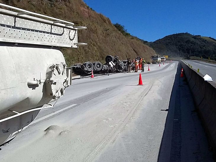 Uma carreta-tanque, carregada com cimento a granel, tombou na BR-040 durante a manhã desta segunda-feira, 31 de agosto, na altura do Km 729, em Oliveira Fortes, a cerca de 76 quilômetros de Juiz de Fora.
