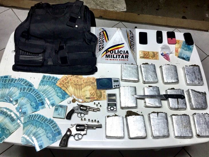 Foram localizados mais de seis quilos de maconha, dois revólveres calibre 38 e 32, seis munições 38 e quatro 32, R$ 14.993,75 e um colete a prova de balas