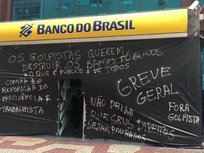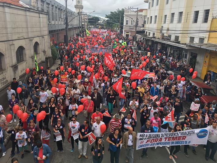 A Greve Geral, organizada por mais de 54 organizações populares e sindicais, reúne centenas de trabalhadores e estudantes nesta sexta-feira, 28 de abril, em manifestação nas ruas centrais de Juiz de Fora. Vários setores paralisaram as atividades e os ônibus urbanos também não estão circulando desde a meia-noite de quinta, 27. Com adesão em todo o país, o ato levanta bandeira contra a Reforma Trabalhista e da Previdência, a terceirização e o governo do atual presidente Michel Temer.