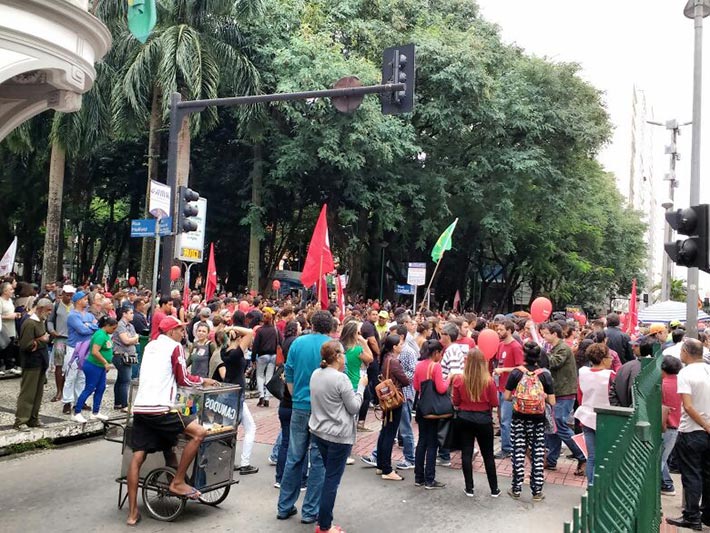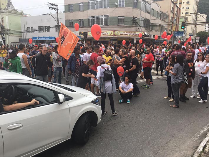 Conforme a manifestação caminha pelas ruas centrais, alguns trechos ficam interditados e depois são liberados. Neste momento, o ato subiu a Rua Barão de Cataguases e parou na avenida Rio Branco, fechando pistas e avenida dos Andradas, na altura do Hemominas. Mesmo preso no trânsito por causa do ato, trabalhadores se posicionam a favor das reivindicações que movimentam o Brasil. O contador Antônio Carlos Ribeiro não concorda com a retirada de direitos trabalhistas já adquiridos. “Por que mudar agora? Enquanto eles conseguem aposentar com três mandatos, o trabalhador tem que aposentar com 69 anos, isso é uma injustiça. Apoio a manifestação e mesmo preso aqui no trânsito, respeito quem está nas ruas”.