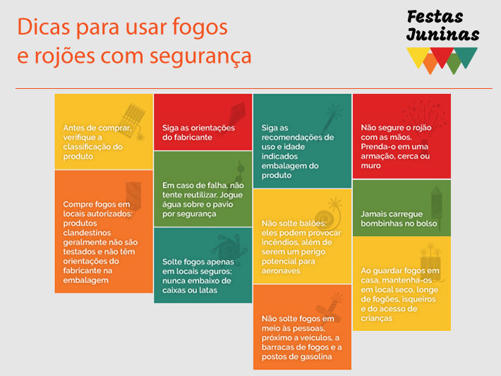 Apesar do uso dos fogos para embelezar as festas, sabemos o quão perigoso é. Um levantamento da Sociedade Brasileira de Ortopedia e Traumatologia (SBOT) feito em 2015, mostra que os acidentes com fogos de artifício triplicam no mês de junho devido às brincadeiras com fogueiras e fogos armazenados ou manuseados de forma incorreta ou irresponsável. Além dos traumas ortopédicos, nesse período do ano, há também aumento de registros nas emergências dos hospitais de casos de queimaduras, comprometimento das córneas, perdas de visão, lesões auditivas e até mortes.
