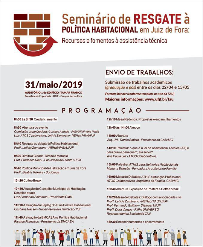 Nesta sexta-feira, 31 de maio, a Universidade Federal de Juiz de Fora (UFJF) vai sediar o Seminário de Resgate à Política Habitacional em Juiz de Fora. O evento, gratuito, começa às 8h, no Auditório 1 do edifício Itamar Franco, na Faculdade de Engenharia. As inscrições serão feitas na hora.