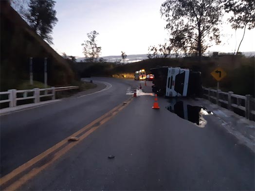 Uma carreta que transportava madeira pinus tombou na madrugada desta quarta-feira, 17 de julho, no km 743, da BR-040, próximo a Santos Dumont. Segundo a Polícia Rodoviária Federal (PRF), o veículos seguia de Carandaí (MG) para Comendador Levy Gasparian (Rj). O acidente foi registrado por volta das 5h e ainda está funcionando no sistema de pare e siga para a remoção do material. A carreta já foi retirada e o acidente não teve vítima.