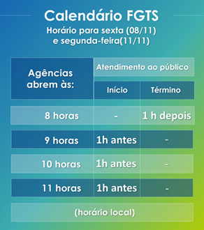 Para facilitar o atendimento, 2.381 agências abrirão em horário estendido na sexta e na segunda-feira. A lista das agências com horário especial de atendimento está no site fgts.caixa.gov.br.