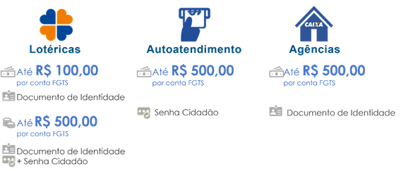 Os trabalhadores podem ser atendidos nos terminais de autoatendimento utilizando apenas a senha do cidadão e, nas casas lotéricas, utilizando a senha do cidadão e apresentando documento de identidade. Quem tem cartão cidadão e senha pode sacar, também, nos correspondentes Caixa Aqui, apresentando documento de identificação. “Para os saques de até R$ 100, a Caixa disponibilizou o saque simplificado, com a utilização apenas do documento de identidade, nas casas lotéricas. Cerca de 20 milhões de trabalhadores poderão contar com essa facilidade”, explica o vice-presidente do Agente Operador CAIXA, Paulo Henrique Angelo.