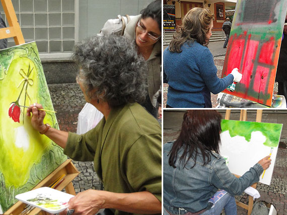Adriana Ribeiro de Souza, uma das artistas participante do encontro, conta do prazer de pintar ao ar livre. É a primeira vez que ela produz uma tela sob os olhares de curiosos. "É muito bom o público ver nosso trabalho sendo feito. Quando a gente pinta, desliga dos problemas e, ao ar livre, parece que estamos mais livres ainda. Está sendo ótimo." Adriana é paciente com esclerose múltipla e tem aulas com a professora de pintura Márcia Marques. Além de Adriana, outras sete pessoas com alguma deficiência, integrantes do grupo de inclusão liderado por Márcia, expressam suas artes, no Calçadão.