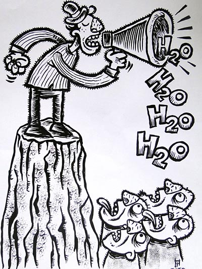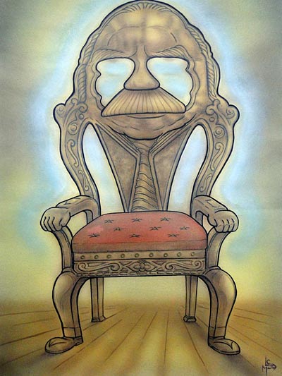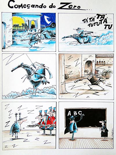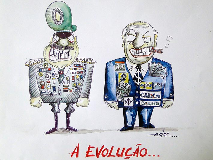 A política não poderia ficar de fora do foco dos artistas. Amorim, que usa o pseudônimo Edra no meio artístico, é produtor cultural, diretor da Casa Ziraldo de Cultura e organizador do Salão Internacional de Humor de Caratinga. Ele revela como o seu cartum foi concebido. "É um paralelo entre os tempos da ditadura militar com a atualidade, em que a onda de corrupção que assola o país leva ao descrédito da classe política", diz o segundo colocado do 4º Salão de Humor de Juiz de Fora. Edra revela ainda que já foi premiado outras vezes, mas estava afastado dos salões há cerca de dez anos: "Logo no retorno consegui esse segundo lugar. É um combustível para continuar".