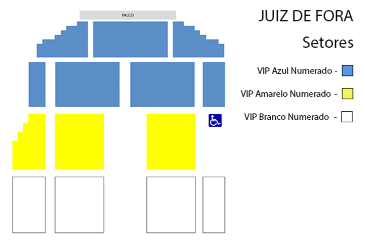 Vip Azul Numerado (inteira - R$ 420), Vip Amarelo Numerado (inteira - R$ 300) e Vip Branco Numerado (inteira - R$ 240).