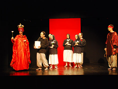 Composto por cinco atores e três atrizes, o elenco vive diversos papéis no sistema coringa. Wall Oliver faz a rainha que abole os julgamentos para evitar a burocracia e vai direto para a sentença; Walmor Machado vive o ministro que rouba o reino para garantir uma velhice próspera; Victor Dousseau é o jardineiro que falsifica as rosas vermelhas; e Dowglas Mota é o espelho mágico comprado no antiquário. Bárbara Borges e Carina Salgado vivem as damas da rainha. Michell Costa vive o carrasco que está cansado de cortar as cabeças do reino. Marina Lopes e o restante do elenco se alternam em diversos papéis.