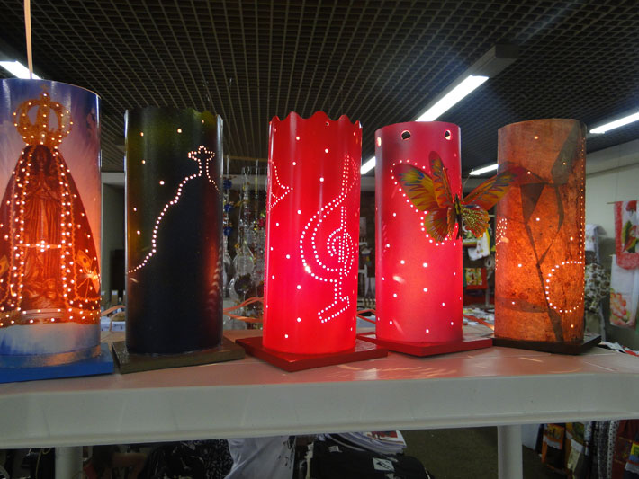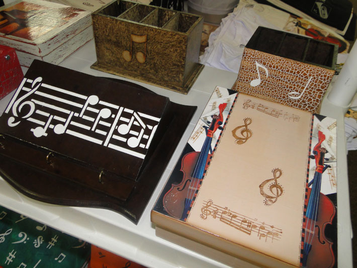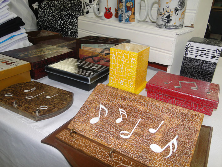 No ramo há 11 anos, a artesã juiz-forana Valesca Frossard expõe peças de vestuário e decoração trabalhadas com símbolos de música. "É a segunda vez que exponho fora de eventos musicais e tenho tido um bom retorno. As técnicas que utilizo são silk screen, pintura e decoupage. Apresento luminárias produzidas com micro-retíficas e adesivos e mais de 60 estampas de camisetas", diz.