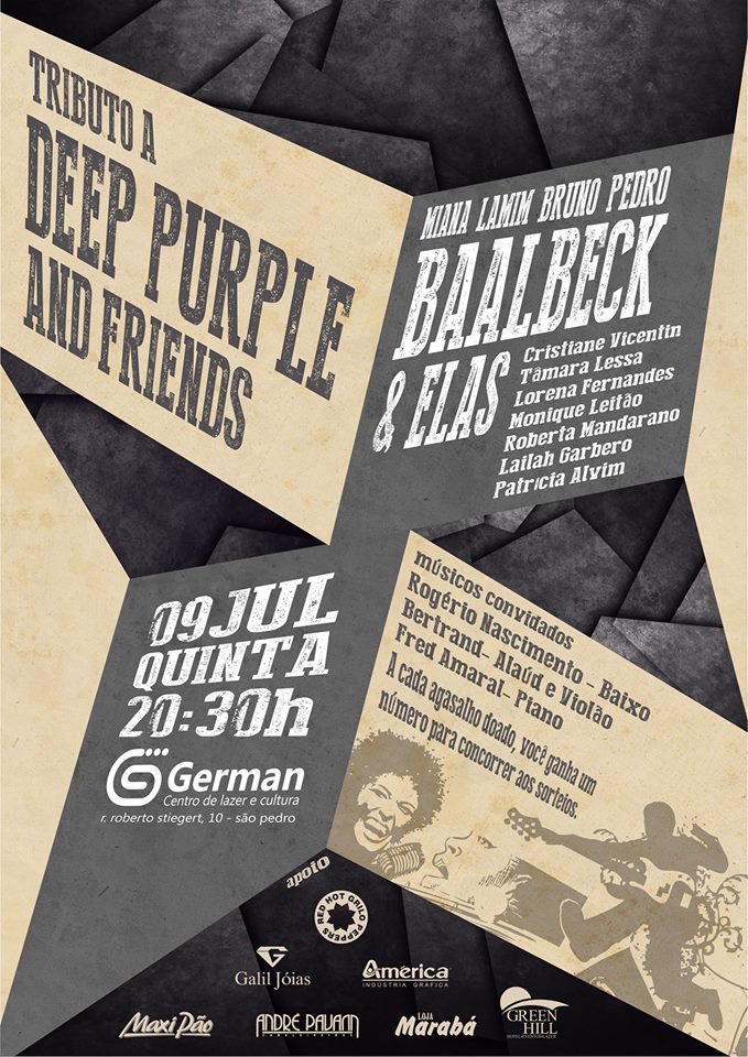 A banda Baalbeck faz tributo a Deep Purple e Friends e convida diversas cantoras para homenagear bandas britânicas e americanas da década de 70, na próxima quinta-feira, 9 de julho, no German, em Juiz de Fora. O vocalista Ronaldo Miana conta que mesmo tendo músicas autorais, a banda gosta de prestar tributos e dessa vez pretende ampliar o show com a participação de sete mulheres, cada uma cantando uma banda. O evento começa às 20h30 e terá ação beneficente, com arrecadação de agasalhos pelo Lions Clube de Juiz de Fora, que são distribuídos para instituições como, Instituto Bruno Viana e Abrigo Santa Helena.