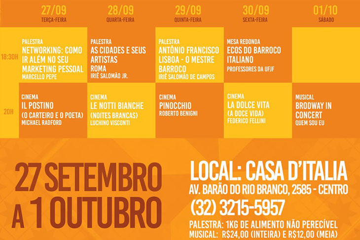 Além dos palestrantes Iriê Salomão de Campos, Marcello Pepe e Iriê Salomão Jr., com temas que abrangem desde história da arte até marketing pessoal, será organizada também a mesa redonda “Ecos do Barroco Italiano”, composta por professores da Universidade Federal de Juiz de Fora (UFJF). Serão exibidos quatro filmes italianos – Il Postino, Le Notti Bianche, Pinnochio e La Dolce Vita –, além do encerramento com a performance Broadway in Concert, da Companhia Teatral Quem Sou Eu, apresentando números clássicos de musicais famosos.