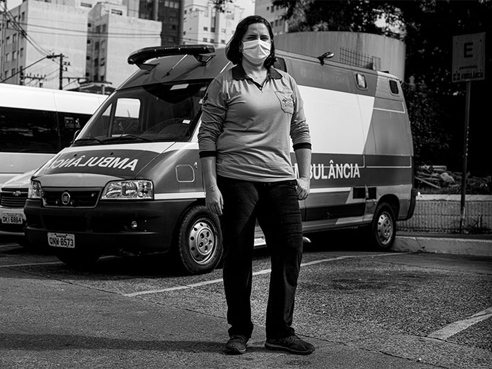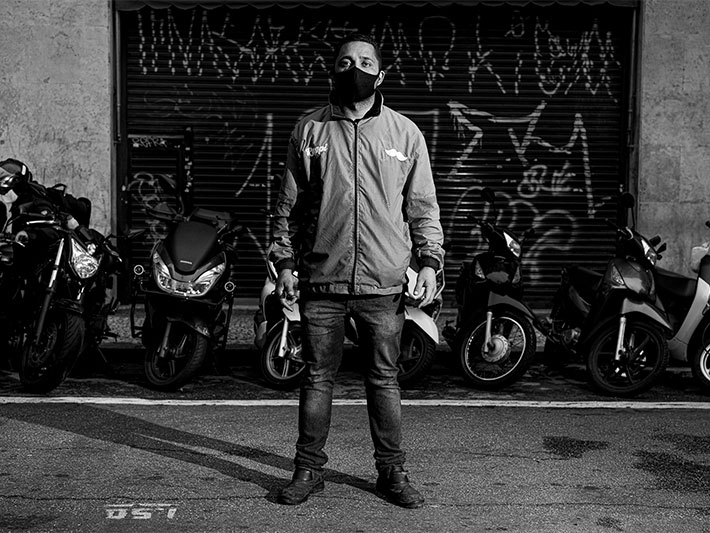 Em preto e branco, os retratos de E Agora? O Brasil e a pandemia de Covid-19 em 24 fotografias de Ale Ruaro captam homens e mulheres em seus ambientes de trabalho, com seus uniformes, veículos ou ferramentas e a indefectível máscara facial que a pandemia impôs a todos como uma forma de se proteger e ao outro. São bombeiros, policiais, motoristas de transporte público e aplicativos, entregadores, repositores de supermercado, caminhoneiros, porteiros, garis, jornalistas, faxineiros, religiosos e outros profissionais cujos serviços são indispensáveis e os expõem aos riscos de contágio.
