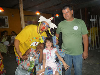 Foto de Antônio Furtado, com palhaço Fuzil e crianças