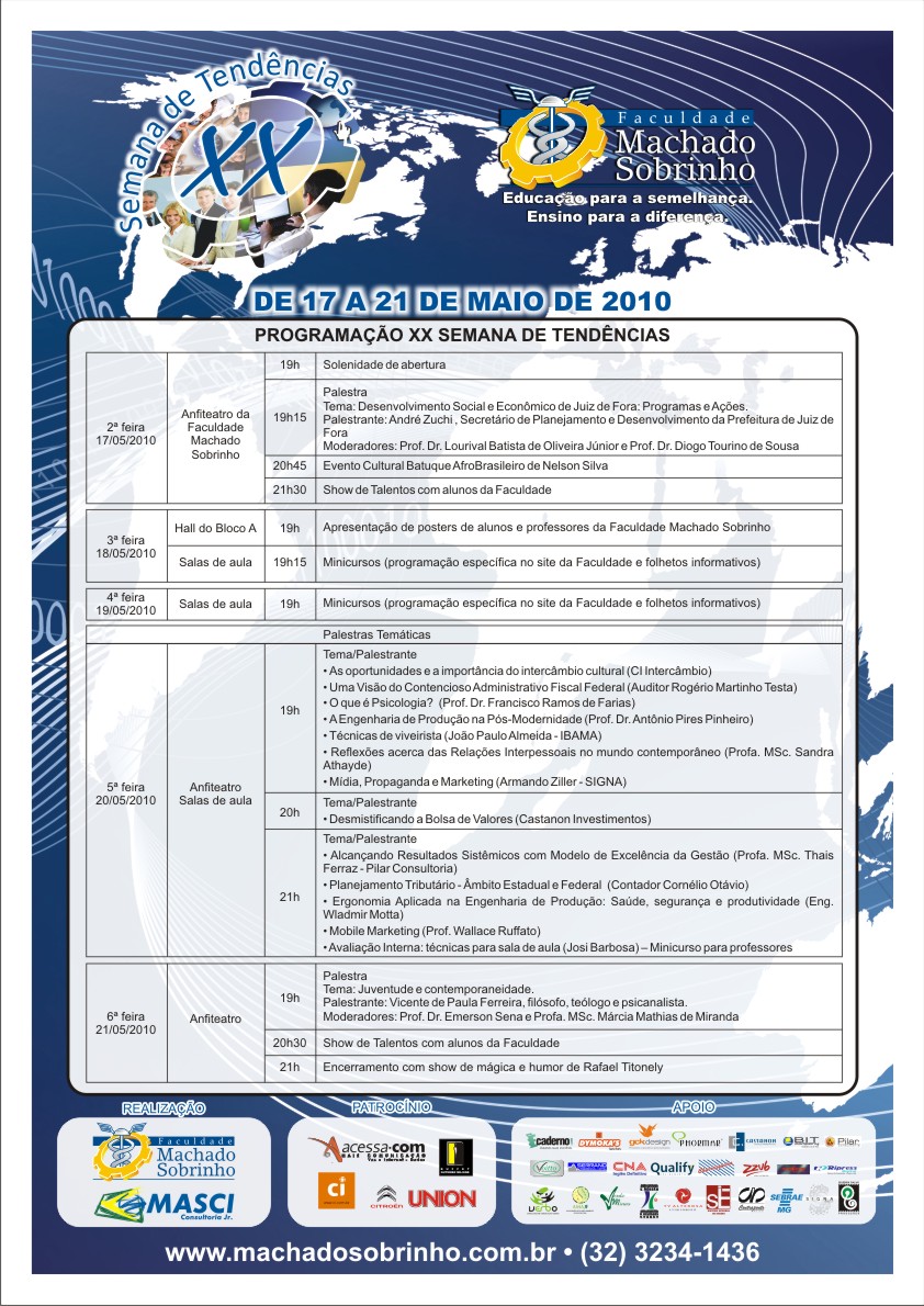 Estudantes, professores, empresários e comunidade em geral poderão, entre os dias 17 e 21 de maio, conhecer tendências nas áreas de administração, eventos, marketing, psicologia, engenharia, contabilidade, entre outras. A abordagem será feita durante a 20ª edição da Semana de Tendências, que ocorre na Faculdade Machado Sobrinho.