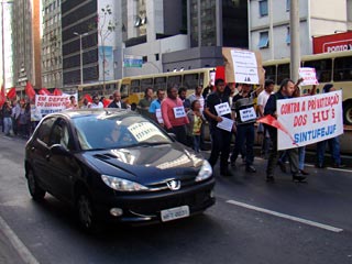 Dezenas de servidores federais de Juiz de Fora realizaram, no início da tarde desta quinta-feira, 9 de agosto, uma manifestação no Centro da cidade. O protesto começou em frente ao prédio da Justiça do Trabalho, ocupando uma pista da avenida Rio Branco. Com faixas e cartazes nas mãos, os grevistas seguiram até o Calçadão da rua Halfeld.