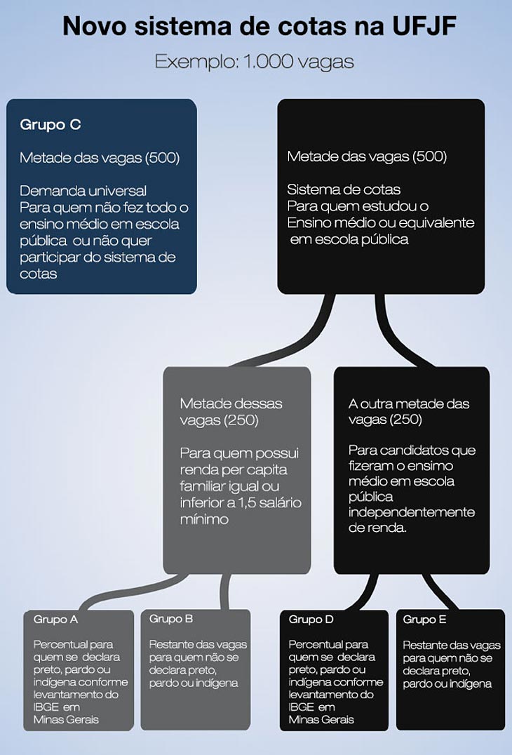 A UFJF separou o sistema em cinco grupos. O candidato deve escolher, ao fazer a inscrição, para o Vestibular 2013 ou para o Programa de Ingresso Seletivo Misto (Pism), de qual grupo irá participar. (veja o quadro abaixo). O grupo C totaliza 50% das vagas e é destinado para os alunos não cotistas. Os outros 50% são para os estudantes que optaram pelo sistema de cotas, sendo que o grupo A é para as pessoas que possuem renda per capita familiar de até 1,5 salários mínimos, o que corresponde atualmente a R$ 933, e que se declararem preto, pardo ou indígena, de acordo com o levantamento realizado pelo Instituto Brasileiro de Geografia e Estatística (IBGE), em Minas Gerais.