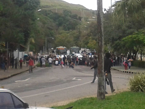 Estudantes da Universidade Federal de Juiz de Fora (UFJF) realizaram, na manhã desta segunda-feira, 18 de maio, uma manifestação, com cartazes e apitaço, para cobrar da instituição uma definição sobre o pagamento de bolsas de apoio estudantil. A ação também prestou apoio à greve dos professores e servidores da Federal. Por volta de meio-dia, os discentes interditaram o Pórtico Norte da Federal, no bairro São Pedro, e deixaram o trânsito parado, gerando um buzinaço por parte dos motoristas. Cerca de 150 manifestantes participaram da ação, que durou cerca de 30 minutos. Após o trânsito ser liberado, os alunos foram ao Restaurante Universitário (RU), onde pretendiam fazer um roletaço.