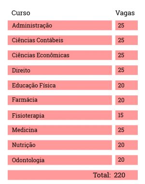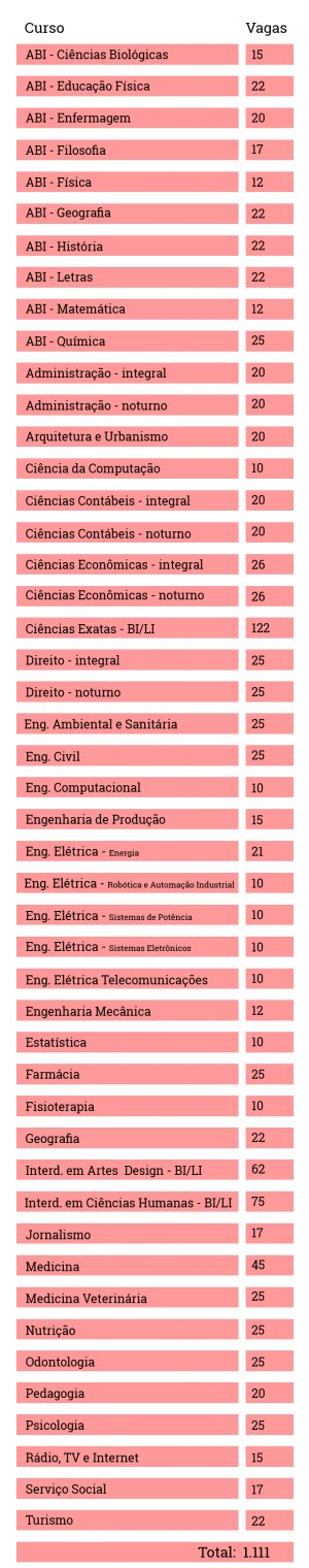 São nove grupos de acesso, com metade das vagas destinada à ampla concorrência e metade aos demais oito grupos, de acordo com o perfil de cada estudante. É possível conferir, no termo de adesão, a quantidade de vagas e quais são os pesos atribuídos às notas em cada área de conhecimento do Enem, o que varia de acordo com o curso escolhido pelo candidato.
