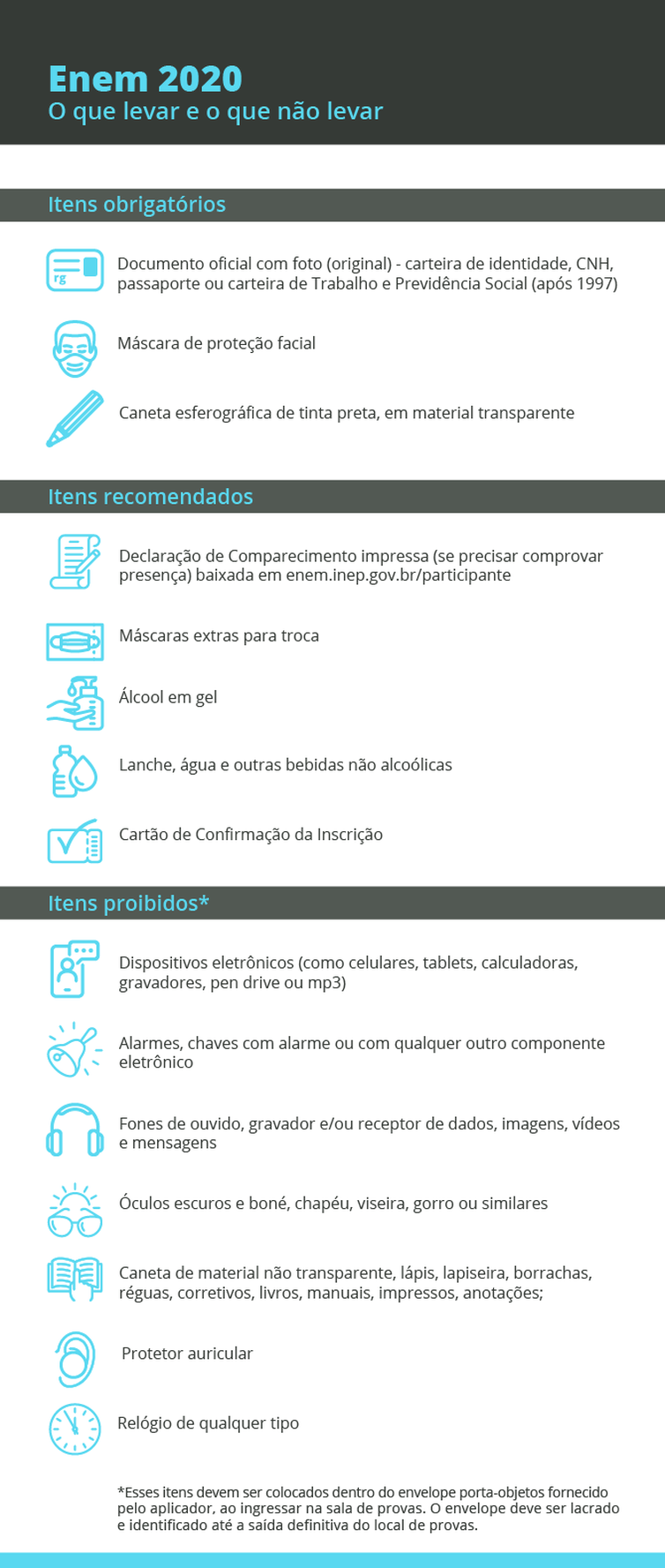 Neste ano, além do documento oficial de identificação com foto e da caneta esferográfica de tinta preta, fabricada em material transparente, itens obrigatórios também nos exames anteriores, a máscara de proteção facial passa a integrar essa lista. Os participantes que não estiverem com máscara de proteção facial não poderão ingressar no local de prova.