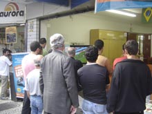As poucas lojas que resolveram exibir o jogo entre Alemanha e Costa Rica nos televisores que estavam ? venda viram o passeio em frente ficar tomado. Gente que passava, s? dava uma espiada, ou parava para ver a partida de abertura do torneio na Alemanha. Gente que n?o confessa estar em hor?rio de trabalho. ?s 14h20, aproximadamente, todos os entrevistados garantiam: estou em hor?rio de almo?o.