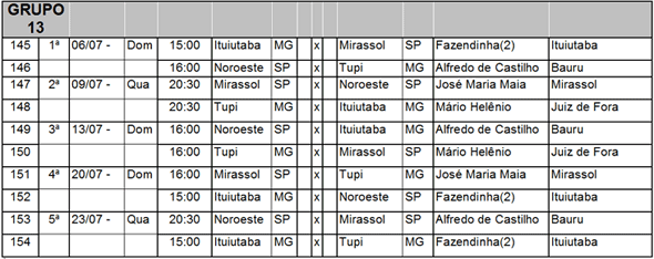O Tupi j? sabe quem s?o os seus advers?rios que vai enfrentar na s?rie C do Campeonato Brasileiro. A CBF divulgou na ?ltima quarta-feira, dia 07 de maio, a tabela da competi??o. O Carij? est? no grupo 13, junto com o Noroeste, Mirassol e Ituiutaba.