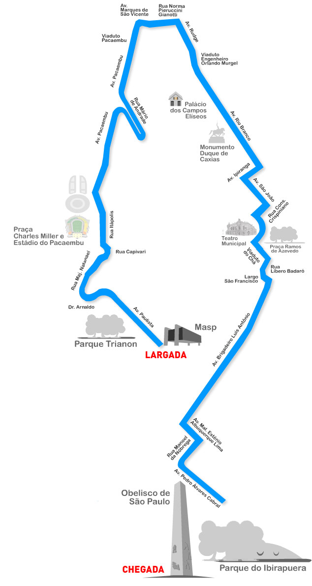 Para Hallack, apesar de já ter sido divulgado o novo trajeto, a prova irá surpreender os atletas. "A saída será em descida. É um percurso novo em que é difícil saber as dificuldades. Apesar disso, aparentemente, será um desafio para todos." Veja o percurso abaixo (clique para ampliar).