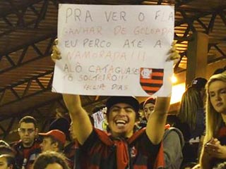 Proibido pela namorada de ir ao jogo, ele não só desobedeceu como levou um cartaz com um versinho que chamou a atenção: "Pra ver o Fla ganhar de goleada, eu perco até a namorada. Alô Cataguases. Tô solteiro!!!".