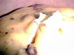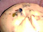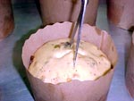 Depois, com a tesoura, corte a superf?cie em cruz e coloque uma colher de ch? de margarina no centro da cruz para que o panetone abra durante o cozimento.