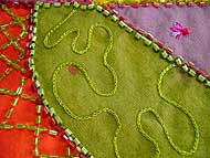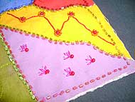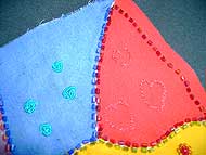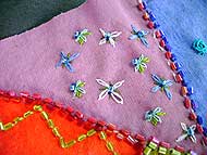 Veja nas fotos acima e abaixo alguns exemplos de bordados que podem ser feitos nas roupas. Voc? pode bordar na pr?pria roupa - se decidir bordar em um pano colorido, ou pintado ? m?o, ? s? costurar na pe?a. Ta?s aproveitou um tecido quadrado pintado por outra menina artes? do projeto. Um luxo s?!