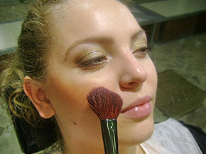 O detalhe vem com o blush, que nunca deve ser aplicado em bolinha. "O correto ? passar da ma?? do rosto em dire??o ? t?mpora, em pequena quantidade"