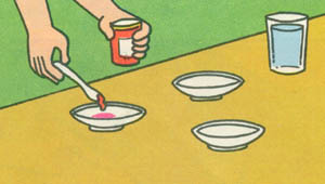 ![]() | Coloque em pratinho um pouco de tinta guache de cores diferentes. Ponha um pouquinho de ?gua e mexa bem. |