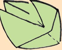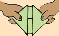 ![]() | Fa?a a mesma coisa com a outra ponta. Elas devem ficar do mesmo tamanho. Voc? vai perceber que a parte debaixo do papel (na horizontal) tem duas pontas. Dobre cada uma para um lado e para cima. Quando dobrar para cima, veja que sobram pontas. Dobre estas pontas para dentro. |