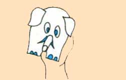 Coloque seu dedo atrav?s do buraco para fazer a tromba do elefante. Brinque com ele no teatro de bonecos.