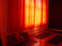 J? a sala da imagem ? esquerda recebe, praticamente, a mesma incid?ncia de luminosidade da rua, mas est? bem laranja. Isso porque o arquiteto e urbanista, Cadu Ribeiro, usou uma cortina de tom laranja bem forte. "Quem v? a sala antes de entrar tem a impress?o que existe uma luz laranja acesa", comenta.