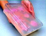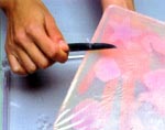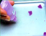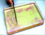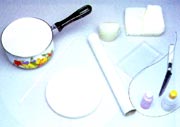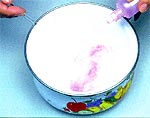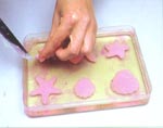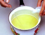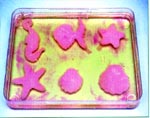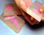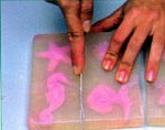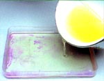 7. Despeje toda a base na f?rma 8. Espere esfriar um pouco e retire a camada esbranqui?ada que se formou. Para isto, use a faca. 9. Mergulhe os seis sabonetinhos na f?rma de acr?lico, como mostram as fotos. |