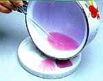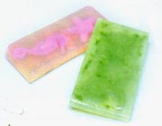 f?rma. 5. Coloque algumas gotas de corante rosa na forma de acrilico 6. Derreta base glicerinada incolor e coloque algumas gotas de ess?ncia de perfume. |