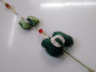 Depois de cortar os moldes, confeccione os fuxicos com o pano americano cru. Em seguida, alinhave e caseie as orelhas, deixando uma pequena abertura para colocar a manta acrílica. Depois, caseie as trombas. Agora é a hora de colocar a manta acrílica nas orelhas. Feito isso, enfeite em volta das orelhas com miçangas. Com a máquina de cola quente, cole o fuxico e a tromba. Para finalizar, costure os olhos (duas miçangas pretas), prendendo, assim, o fuxico com a tromba e a orelha. O cordão deve ser feito com um metro de linha para bordar. Dobre ao meio e enfeite com miçangas. Coloque na ponta superior a argola e prenda os dois elefantes. Está pronto o móbile.