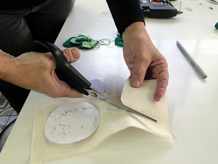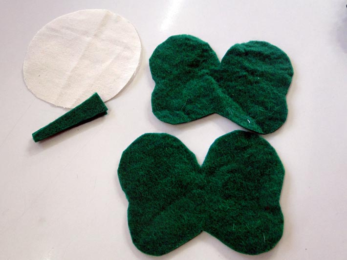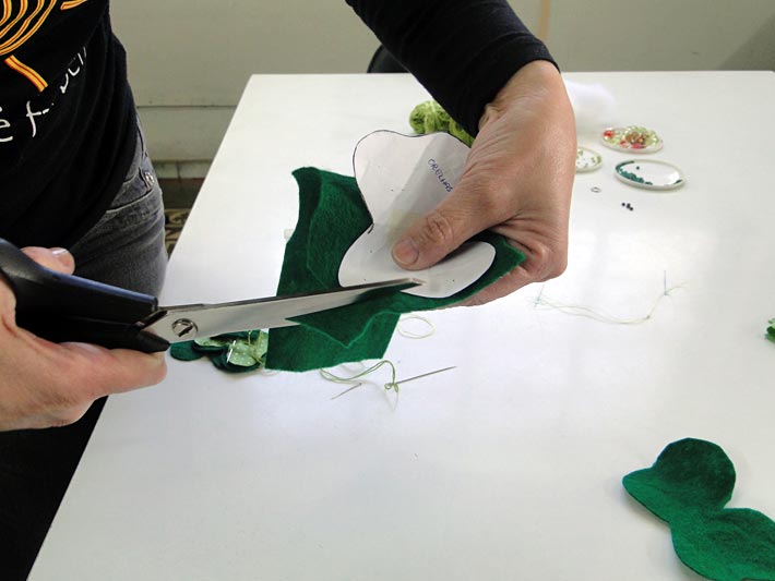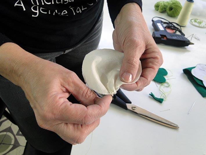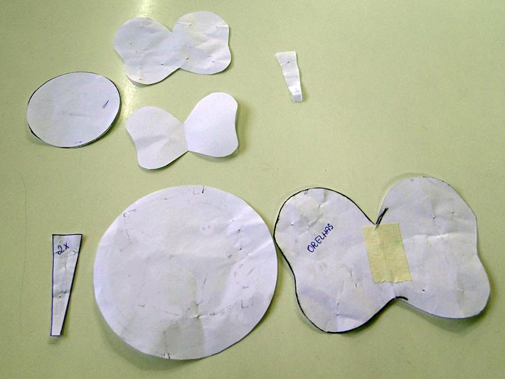 Primeiro corte os moldes (ver galeria abaixo). Para os fuxicos, vamos fazer dois círculos. Um de nove centímetros de diâmetro e outro de 5,5 centímetros. Para as orelhas, faremos três moldes. O maior deve medir 10x8; o médio, 7x5 e o menor, 6x4.