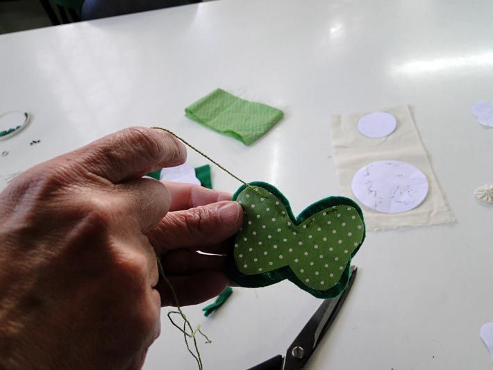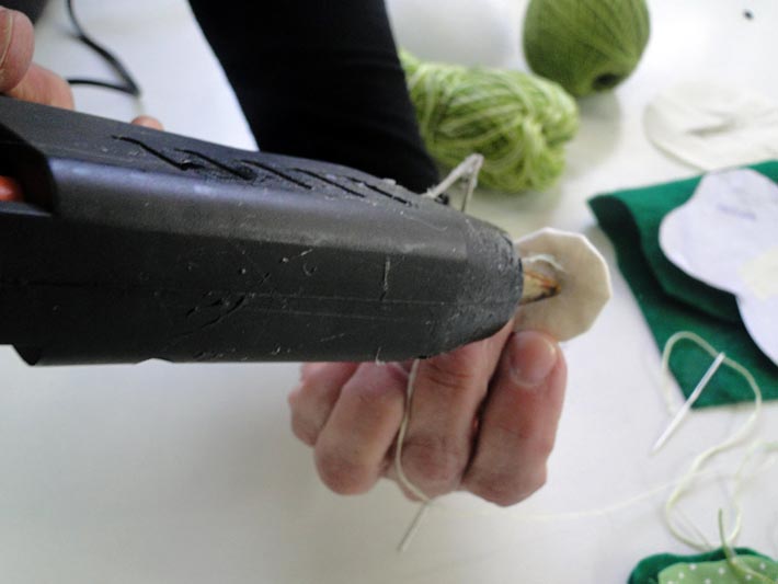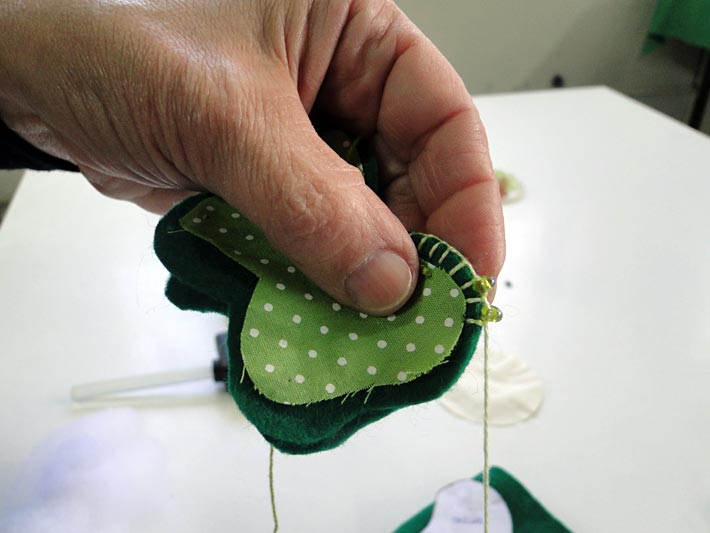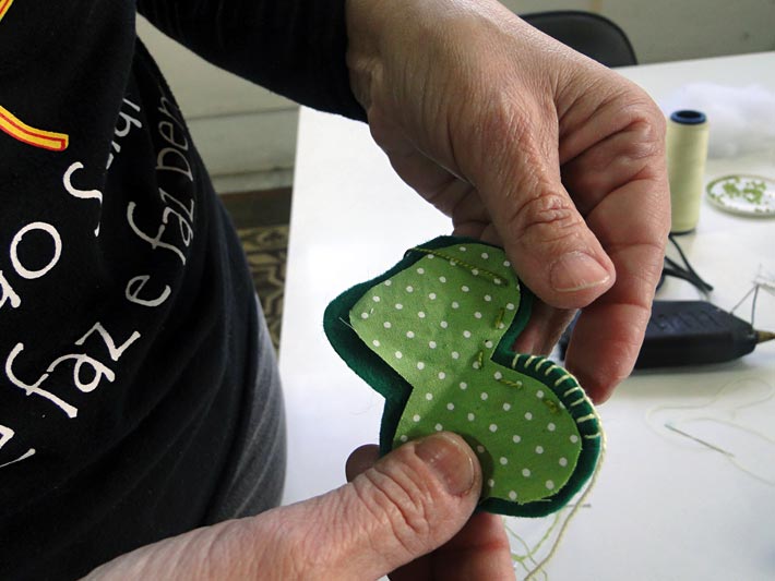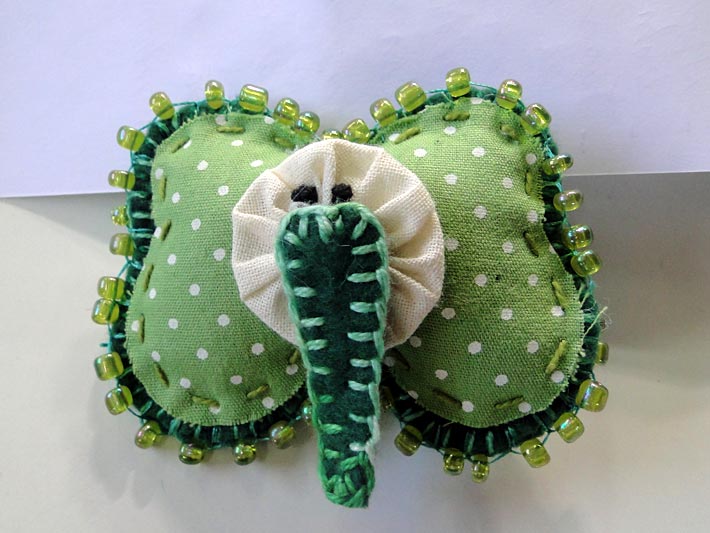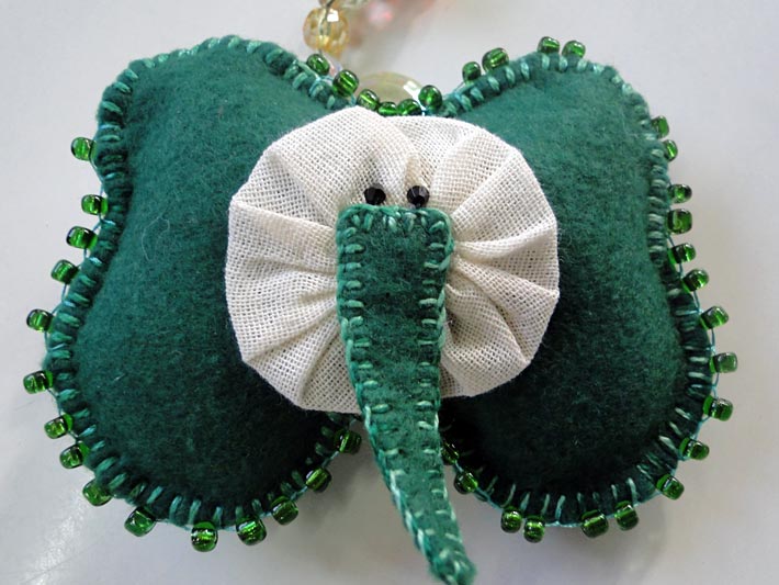 Depois de cortar os moldes, confeccione os fuxicos com o pano americano cru. Em seguida, alinhave e caseie as orelhas, deixando uma pequena abertura para colocar a manta acrílica. Depois, caseie as trombas. Agora é a hora de colocar a manta acrílica nas orelhas. Feito isso, enfeite em volta das orelhas com miçangas. Com a máquina de cola quente, cole o fuxico e a tromba. Para finalizar, costure os olhos (duas miçangas pretas), prendendo, assim, o fuxico com a tromba e a orelha. O cordão deve ser feito com um metro de linha para bordar. Dobre ao meio e enfeite com miçangas. Coloque na ponta superior a argola e prenda os dois elefantes. Está pronto o móbile.