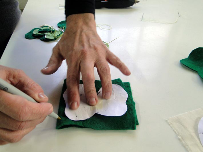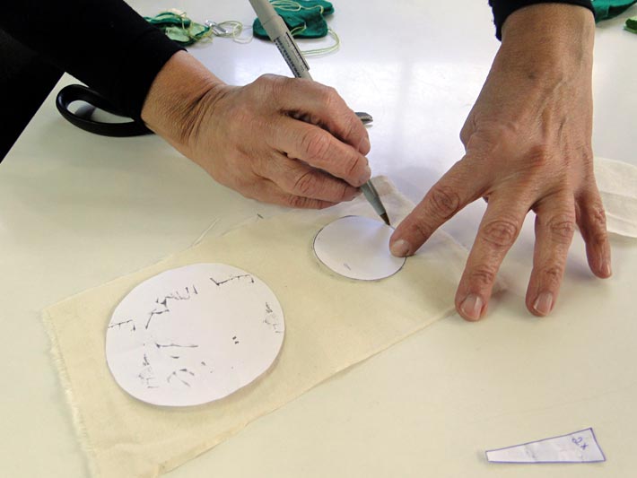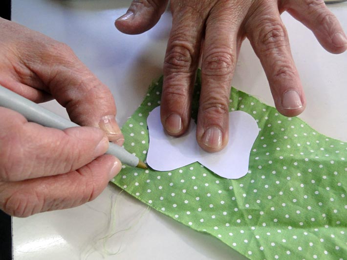Marque no pano americano cru os moldes redondos. No feltro colorido, marque as orelhas. Para isso, use os moldes maior e médio. Faça dois de cada. Com o feltro colorido também faça as trombas. Duas de cada. E com o pano colorido, faça o molde da orelha menor.