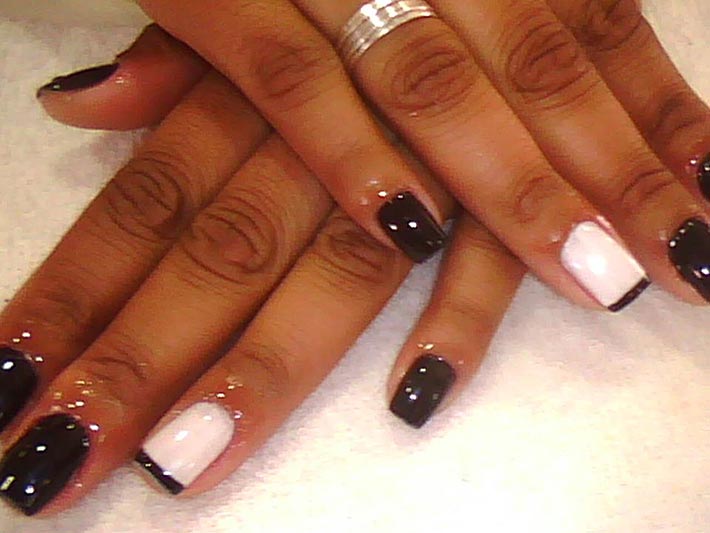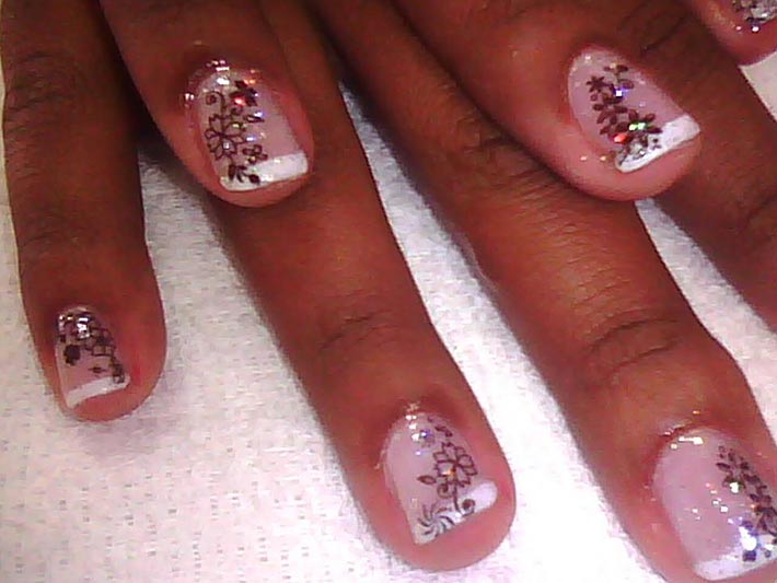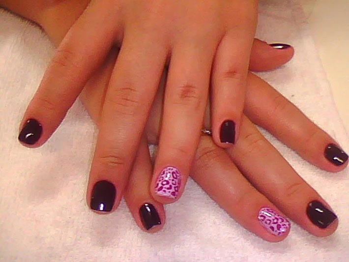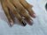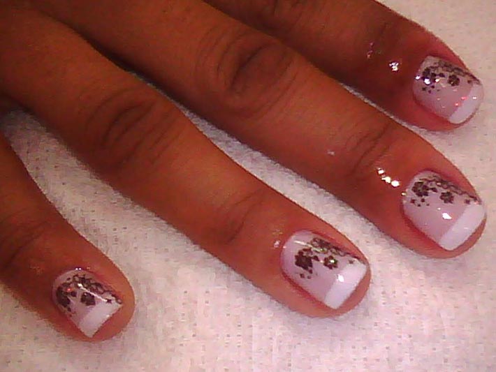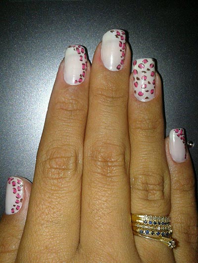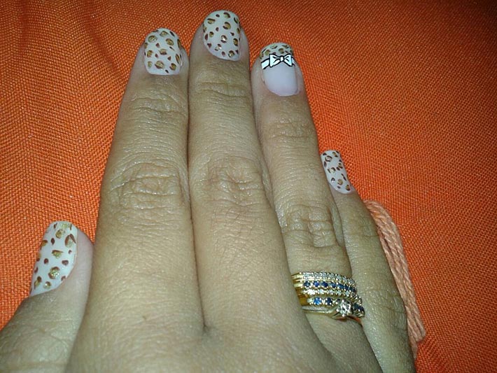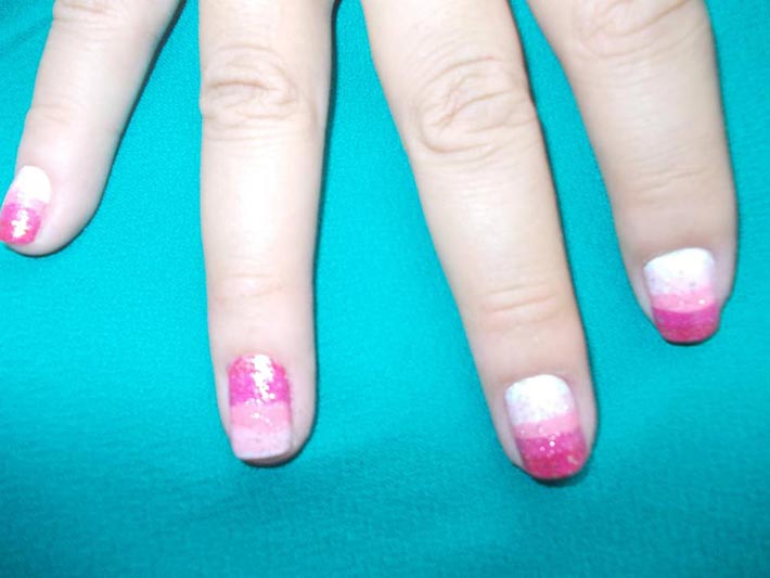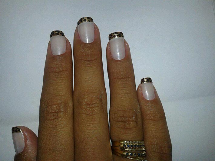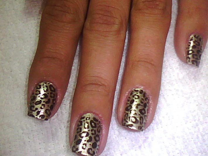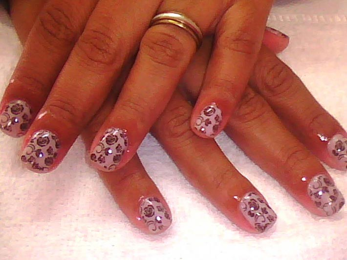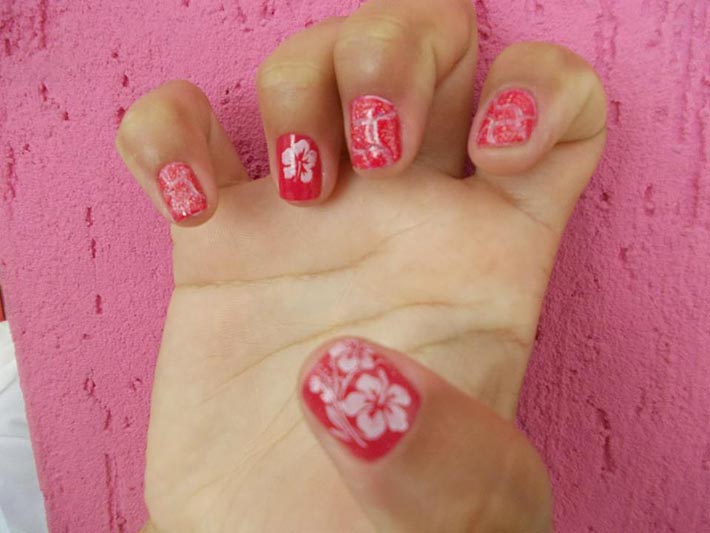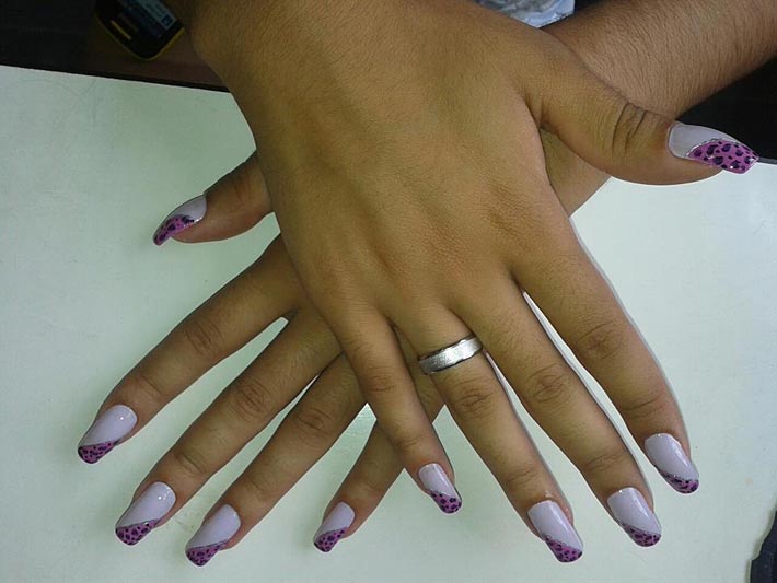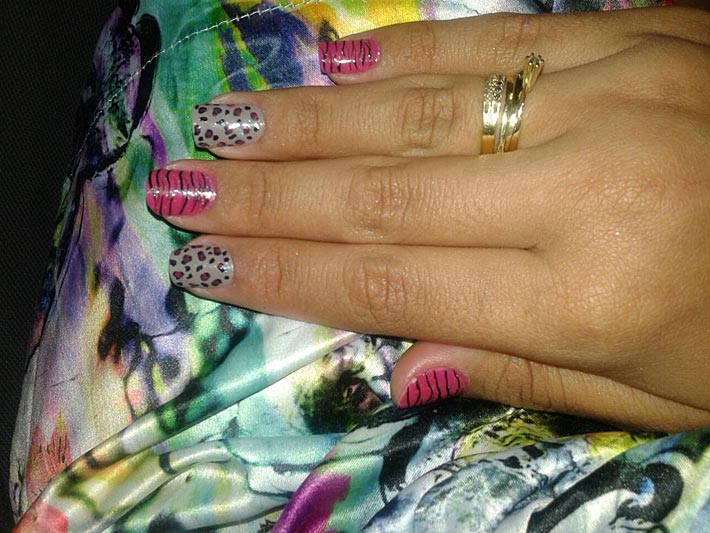 Já a manicure Mônica Pedretti realiza seus trabalhos de unhas decoradas com pincéis, feitos à mão. "Eu mesma pinto as unhas com tinta de tecido e depois passo o extra brilho para fixar. Entre os mais pedidos, estão as formas de oncinha, zebra, florzinha ou mesclado com a moda de 'filha única'", expõe. Segundo ela, muitas clientes trazem aqueles desenhos com os quais gostariam de decorar e outros são sugeridos por ela. "Eu mesma não sabia dessa minha habilidade, porque estava só acostumada com francesinha [quando se aplica esmalte branco nas pontas das unhas], principalmente para as unhas dos pés. Aos poucos, fui aperfeiçoando e hoje em dia tem tido muita procura", diz.