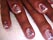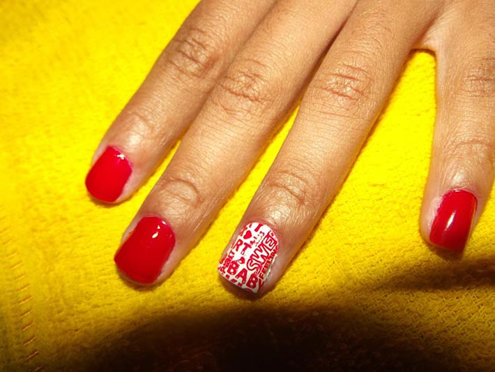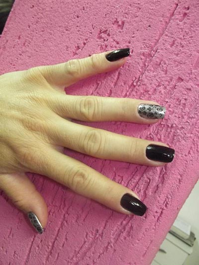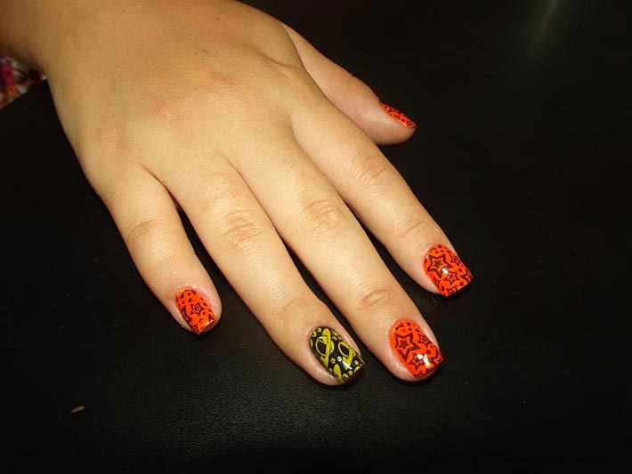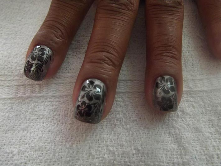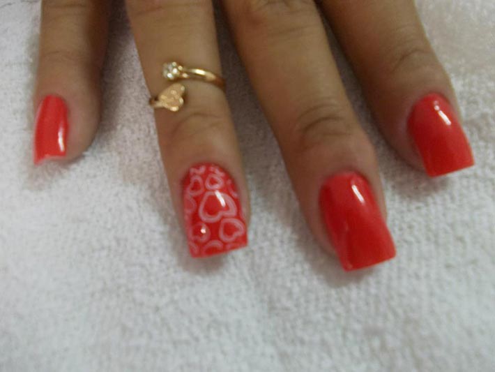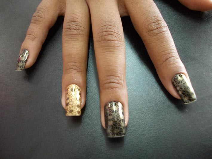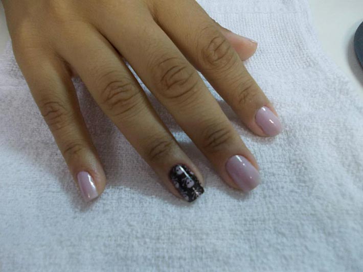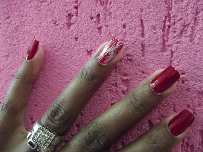 A principal decoração utilizada pela profissional é à base de carimbo. "Compramos as 'plaquinhas' originais para colocar nas unhas, porque elas dão um aspecto mais perfeito para o trabalho. O material é feito à base de alumínio e vem acompanhado de um carimbo de borracha e um raspador de plástico", explica. Segundo ela, a aplicação é feita da seguinte forma: "Primeiro, passamos o esmalte na placa em cima do desenho, tiramos o excesso com o raspador e depois passamos a borrachinha na placa. Logo em seguida, carimbamos o desenho da unha e aí passamos o selante por cima, para durar mais", ensina.