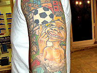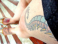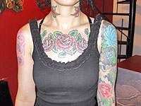 Foto das tatuagens de Jackeline A bargirl de uma casa noturna da cidade, Jackeline Silva (foto ao lado), de 30 anos, diz que tinha consciência do preconceito antes de fazer suas nove tatuagens. "Eu sei que alguns setores do mercado de trabalho julgam pela aparência. Mesmo assim, acho que o preconceito acaba quando a pessoa rompe a barreira do pré-julgamento e conversa comigo."